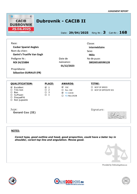 - - CACIB Dubrovnik 2025 (Croatie) : 1er Excellent classe Intermédiaire, 2xCAC, 2xCACIB